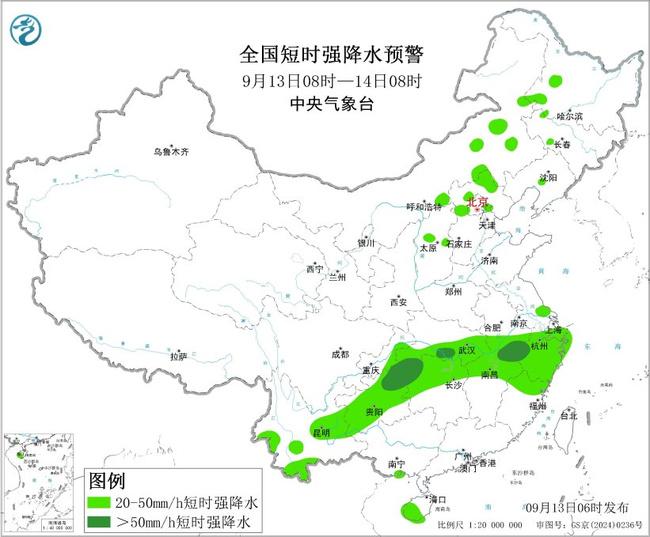 预计9月13日08时至14日08时,内蒙古中东部、华北中北部、江南北部等地的部分地区将有8级以上雷暴大风或冰雹天气,其中,内蒙古中部、河北北部、山西中部等地的部分地区将有10级以上雷暴大风;江汉南部、江淮南部、江南北部、西南地区东部和南部等地的部分地区将有小时雨量大于20毫米的短时强降水天气,其中,安徽南部、江西北部、浙江西部、湖北南部、湖南西北部、重庆东南部、贵州东北部等地的部分地区小时雨量大于50毫米,最大可达60毫米以上。