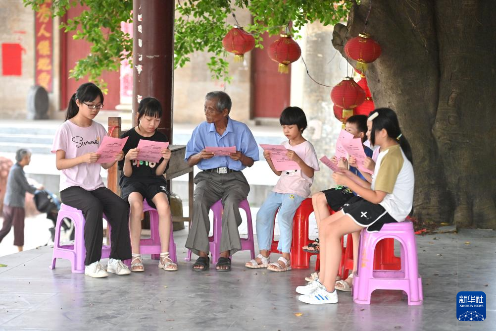 在梧州市长洲区长洲镇泗洲村,陈明仲(左三)在教小学生唱下俚歌(8月24日摄)。