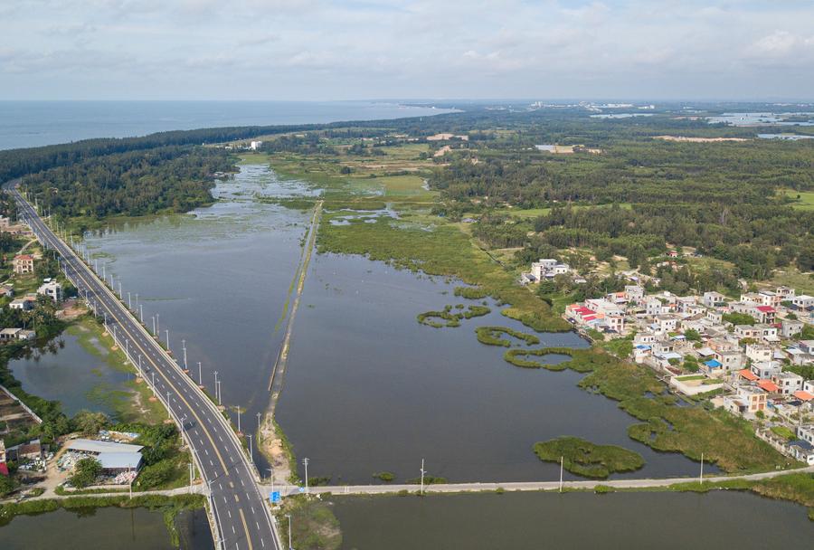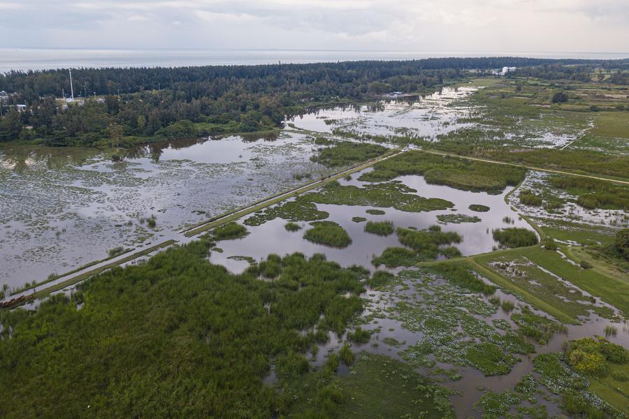 An aerial drone photo taken on Oct. 3, 2025 shows a view of the Haiwei National Wetland Park in Changjiang Li Autonomous County, south China's Hainan Province. (Xinhua/Pu Xiaoxu)