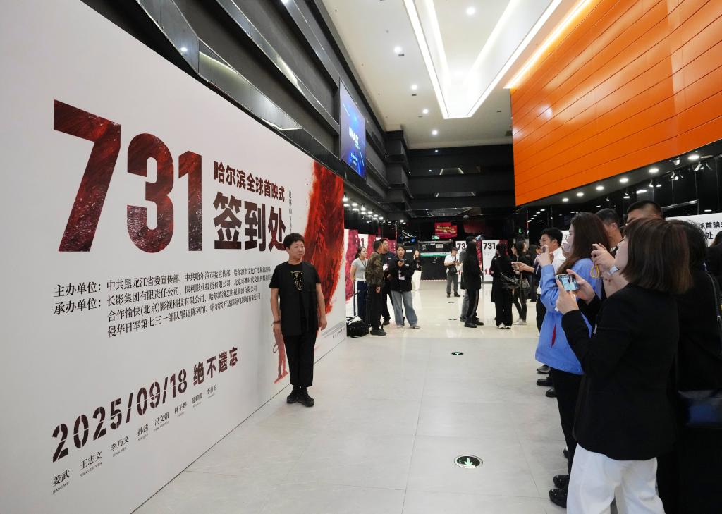 9月17日,观众在哈尔滨市哈东万达影城《731》全球首映仪式现场拍照。新华社记者 王松 摄