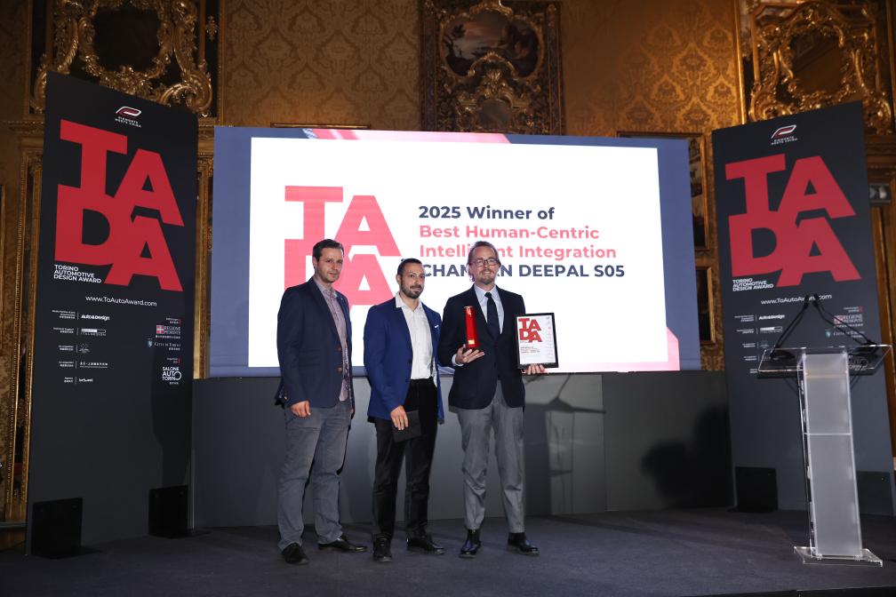 9月26日,在意大利都灵,荣获“都灵汽车设计奖”最佳智能人机融合奖的长安“深蓝S05”代表领奖。