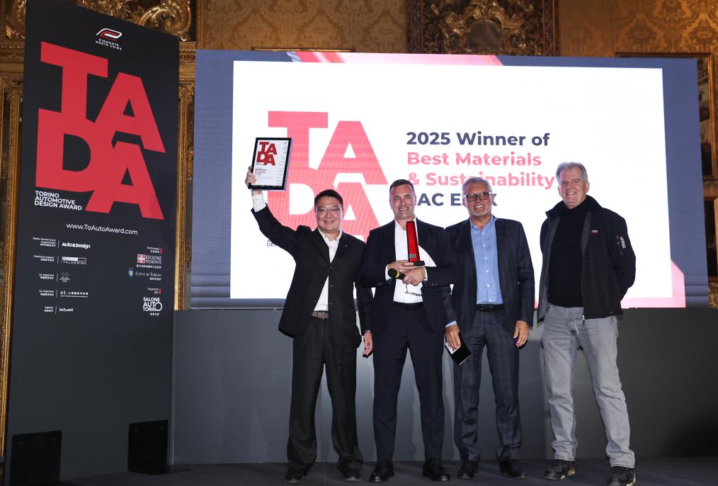 9月26日,在意大利都灵,荣获“都灵汽车设计奖”最佳材料及可持续发展奖的江淮“钇为3”代表领奖。