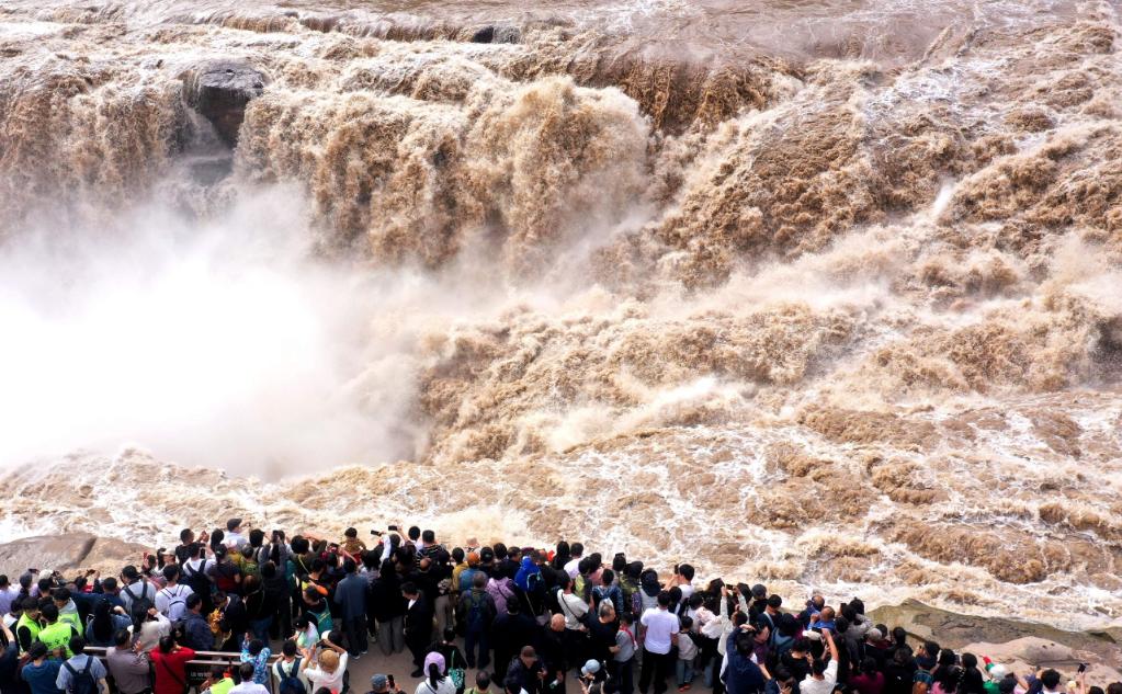 10月4日,游客在黄河壶口瀑布景区欣赏“金瀑飞流”美景。(吕桂明 摄)