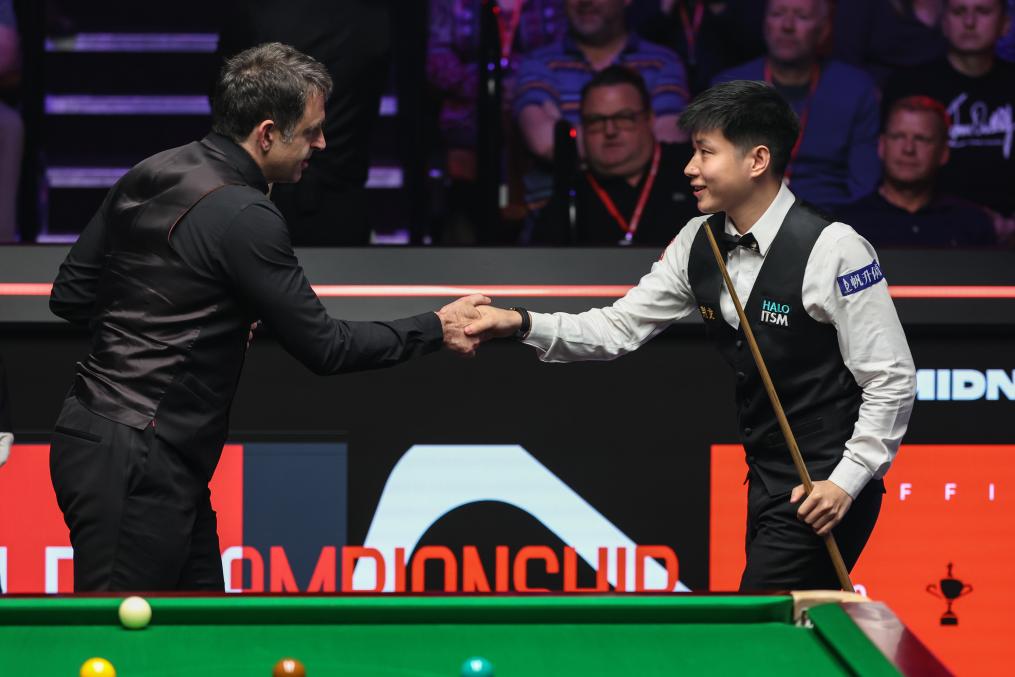 5月2日,赵心童(右)在英国谢菲尔德进行的2025年斯诺克世锦赛半决赛比赛前与奥沙利文握手致意。新华社发(翟政摄)