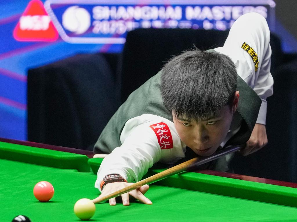 8月2日,赵心童在2025世界斯诺克上海大师赛半决赛中击球。新华社记者 丁汀 摄
